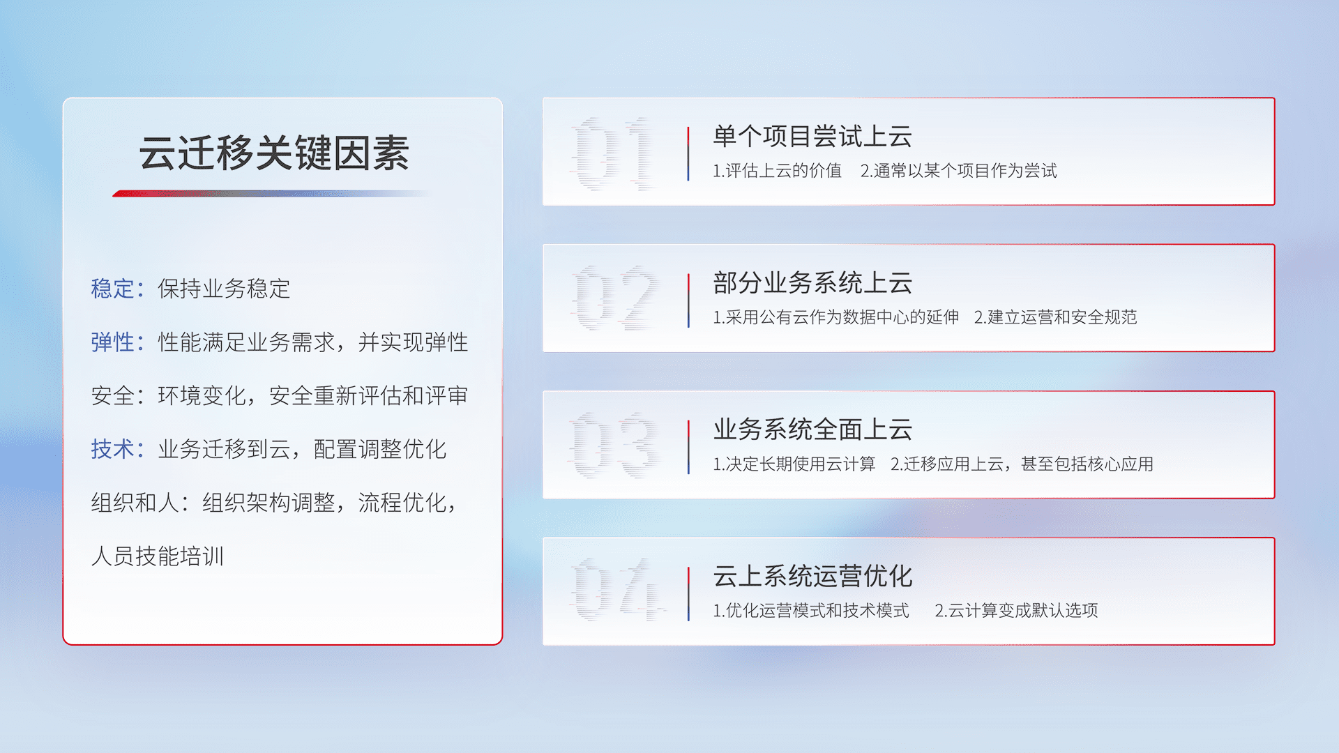 结合实际业务,,,从规划设计、、、、云平台选型、、、、云原生改造、、、数据迁移、、、集成交付,,迁移全过程为客户识别最佳上云路径,,,,做好风险识别管理,,,设计网络架构、、身份权限、、安全审计合规、、、操作审计、、日志审计、、、、监控告警策略、、、、多站点容灾设计等,,,对云上基础设施进行整体规划,,,,提升IT治理水平,,以满足弹性、、、、高可用、、、、高性能的需求。。。