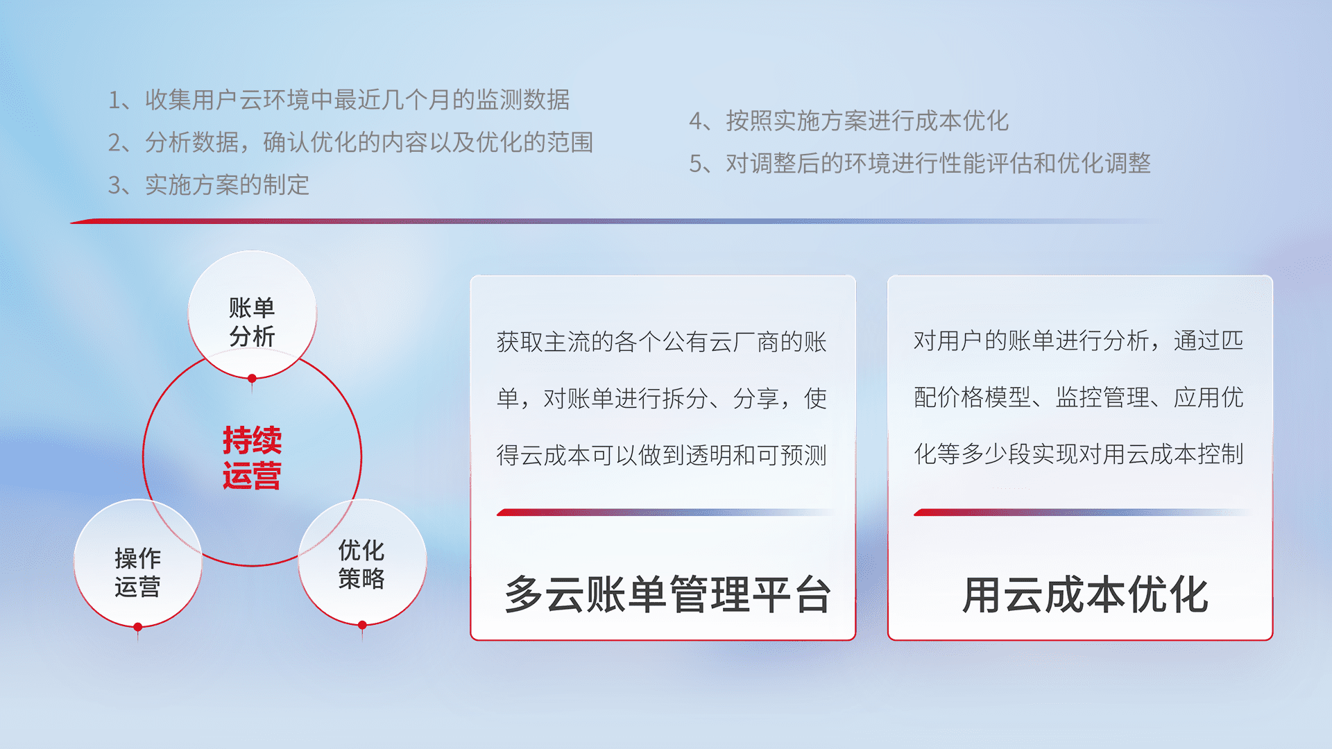 通过多云纳管,,以统一的资源数据模型把客户的云资源进行抽象和封装,,进而实现对多云资源的统一操作,,,保障云资源管理的可靠性、、、、稳定性与可用性。。。。量身定制化运维内容,,配置、、开发运维、、补丁管理、、、、备份、、、、监控、、认证和访问管理、、、审计和日常巡检等,,,,保障在用云过程中的可靠度,,稳定度以及高可用率。。